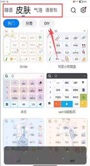 2、进入QQ输入法的皮肤板块,在萌语、气泡等分类中挑选喜欢的皮肤样式。