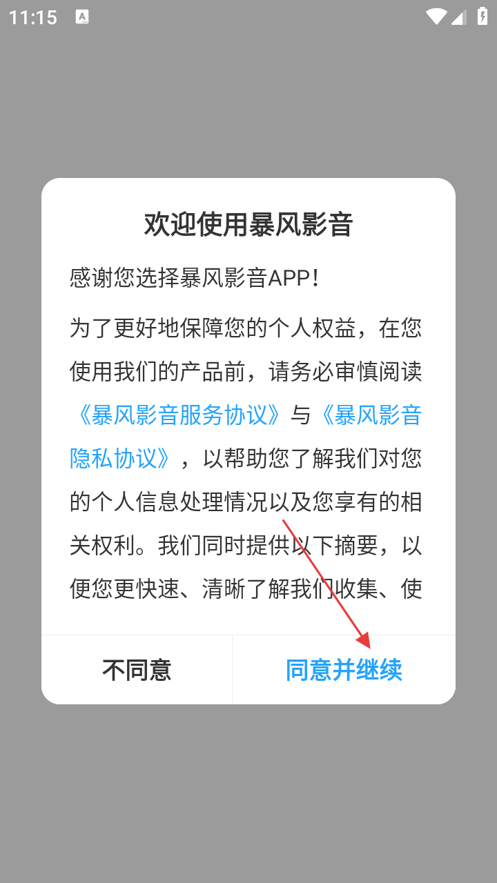 1、首次使用暴风影音,会弹出服务协议提示框,仔细阅读后点击【同意并继续】,即可进入APP。