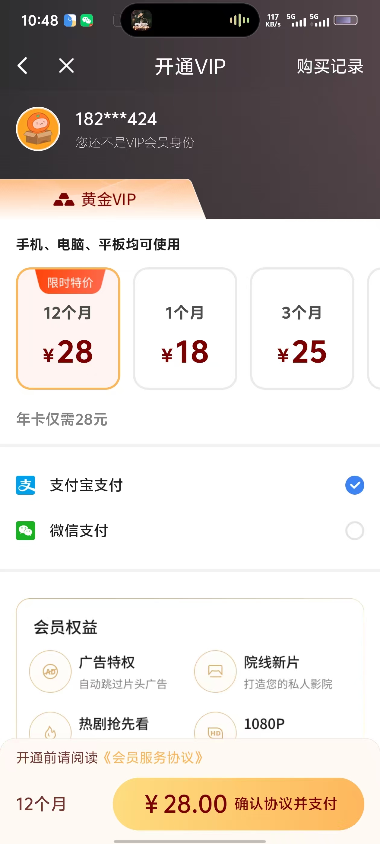 4、若想开通VIP,在相关页面可选择黄金VIP时长,如【12个月-¥28】等,还能选支付宝或微信支付,享受广告特权等会员权益。