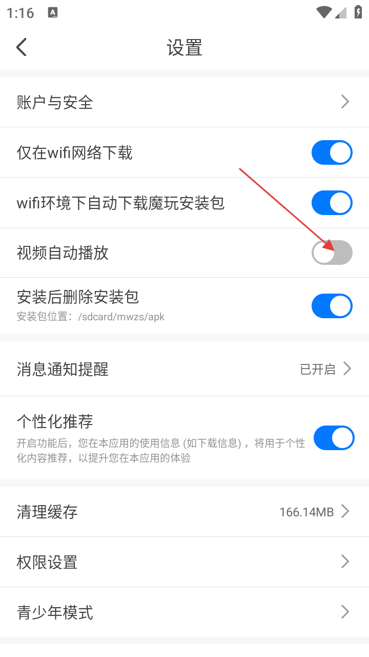 3、在设置页面,若要开启视频自动播放功能,点击【视频自动播放】右侧开关,开启该功能。