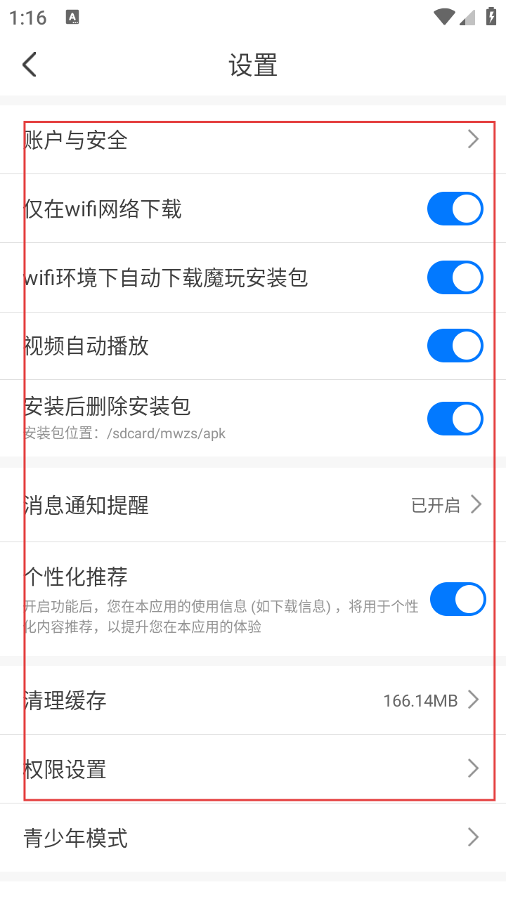 4、开启视频自动播放功能后,可根据需求,对【账户与安全】【仅在wifi网络下载】等其他设置项进行查看或调整。