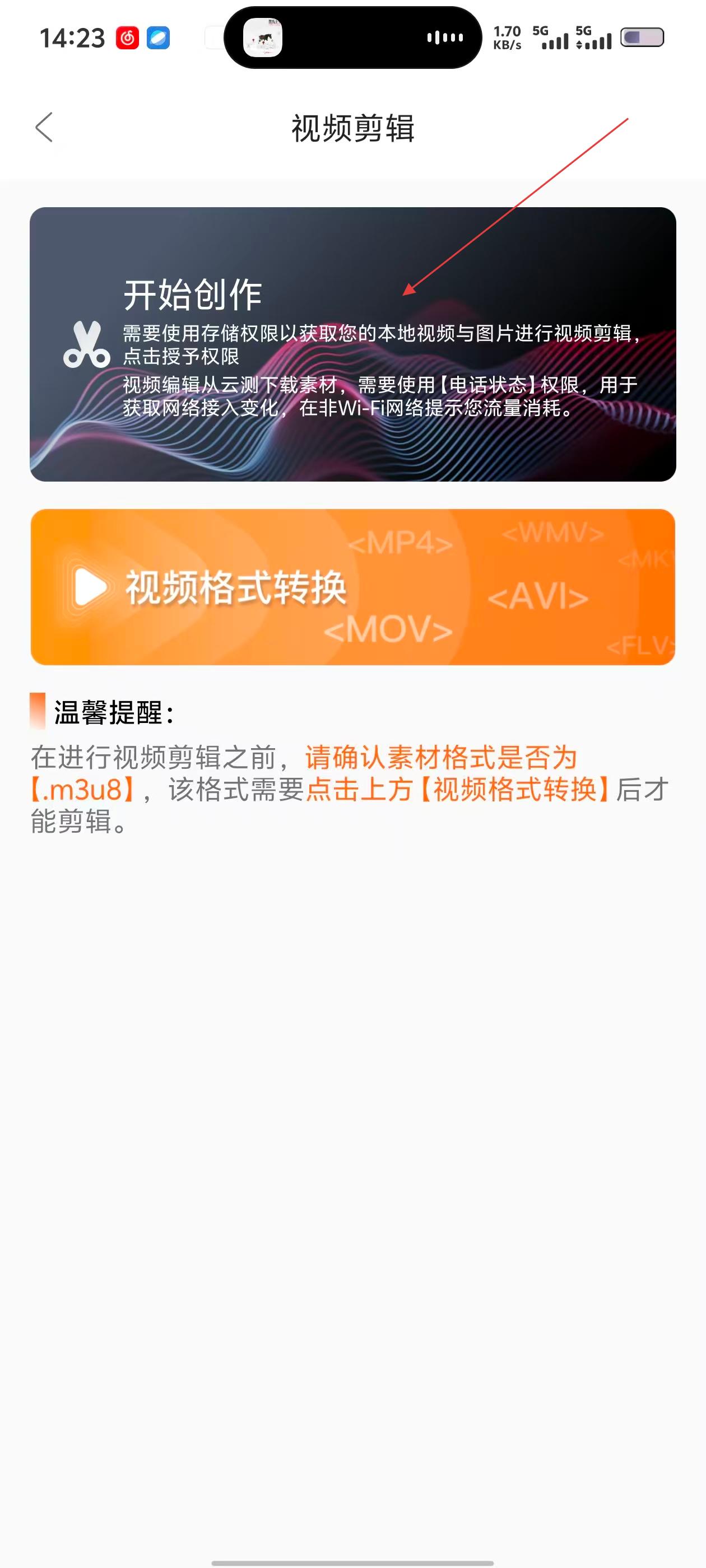 3、在视频剪辑页点击【开始创作】区域,授予存储权限后可选取本地视频与图片进行剪辑。