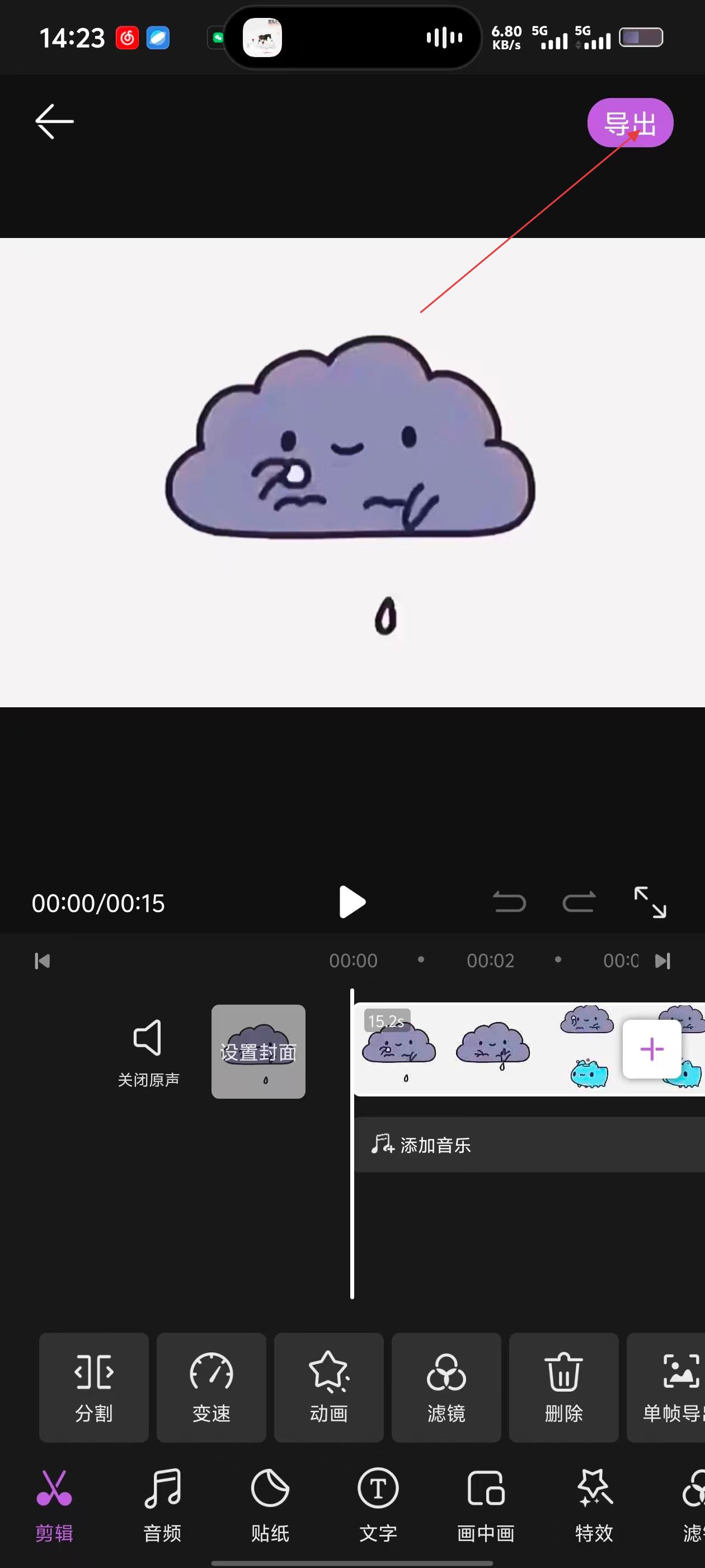 4、完成视频剪辑后,点击右上角【导出】按钮,即可保存剪辑好的视频。