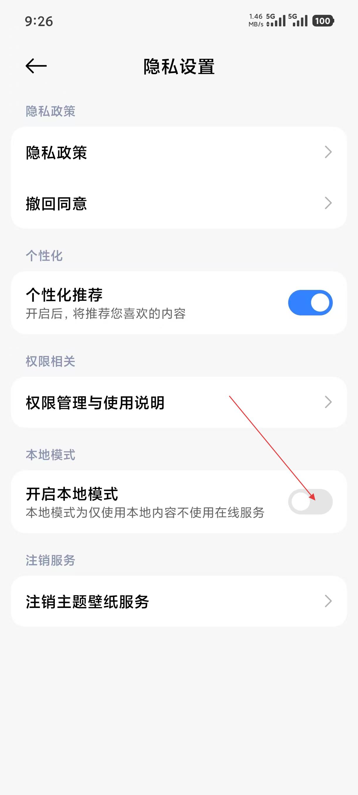 4、在隐私设置界面中,找到【开启本地模式】选项,点击开关可开启该功能,开启后仅使用本地内容,不使用在线服务。