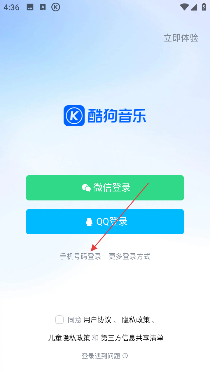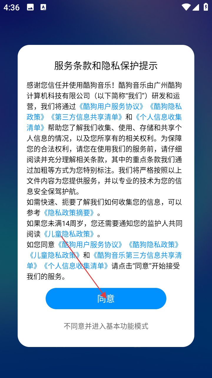 1、打开酷狗音乐,在服务条款和隐私保护提示页面,点击【同意】,进入登录界面。