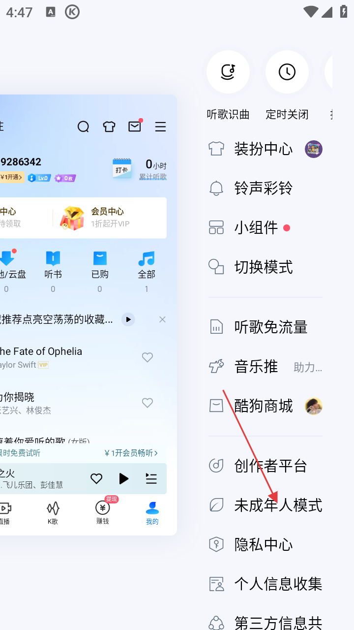 1、在酷狗音乐首页,点击底部的【我的】选项,进入个人中心页面。