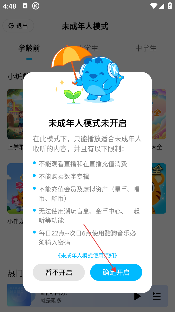 4、在未成年人模式设置页面,点击【确定开启】按钮,即可开启未成年人模式。