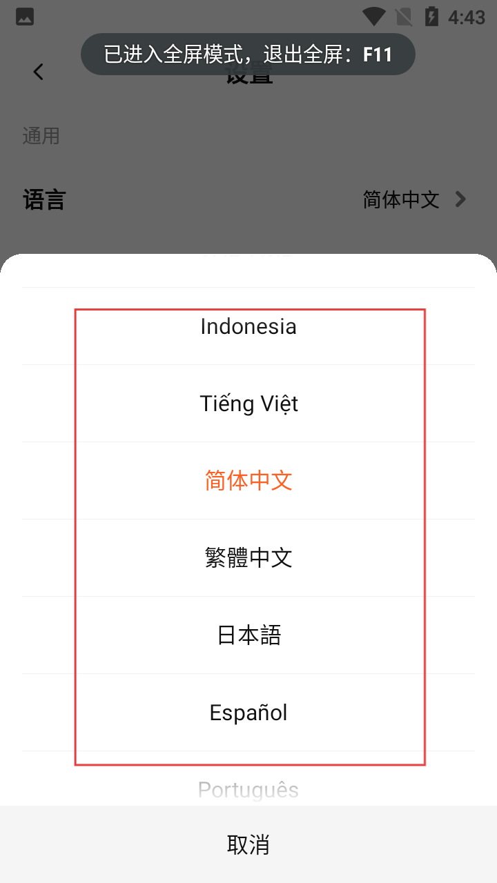 4、在语言选择界面,可选择【Indonesia】【Tiếng-Việt】【简体中文】等多种语言。