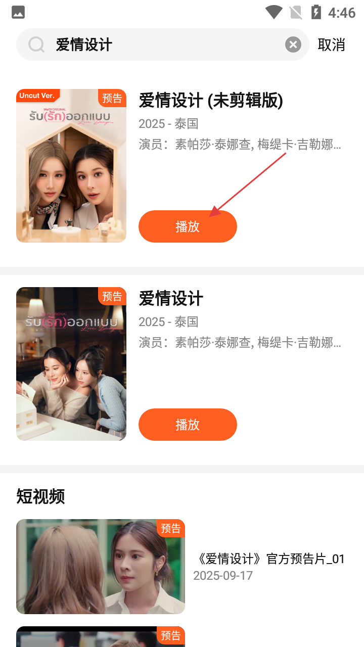 3、在搜索结果中,找到【爱情设计-(未剪辑版)】,点击其右侧【播放】按钮,进入播放页面。
