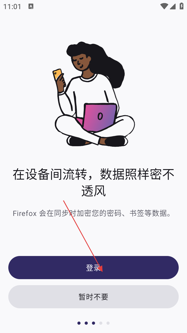 1、Firefox浏览器在设备间流转数据时会加密密码、书签等,若要同步数据,可点击【登录】按钮开始登录流程。
