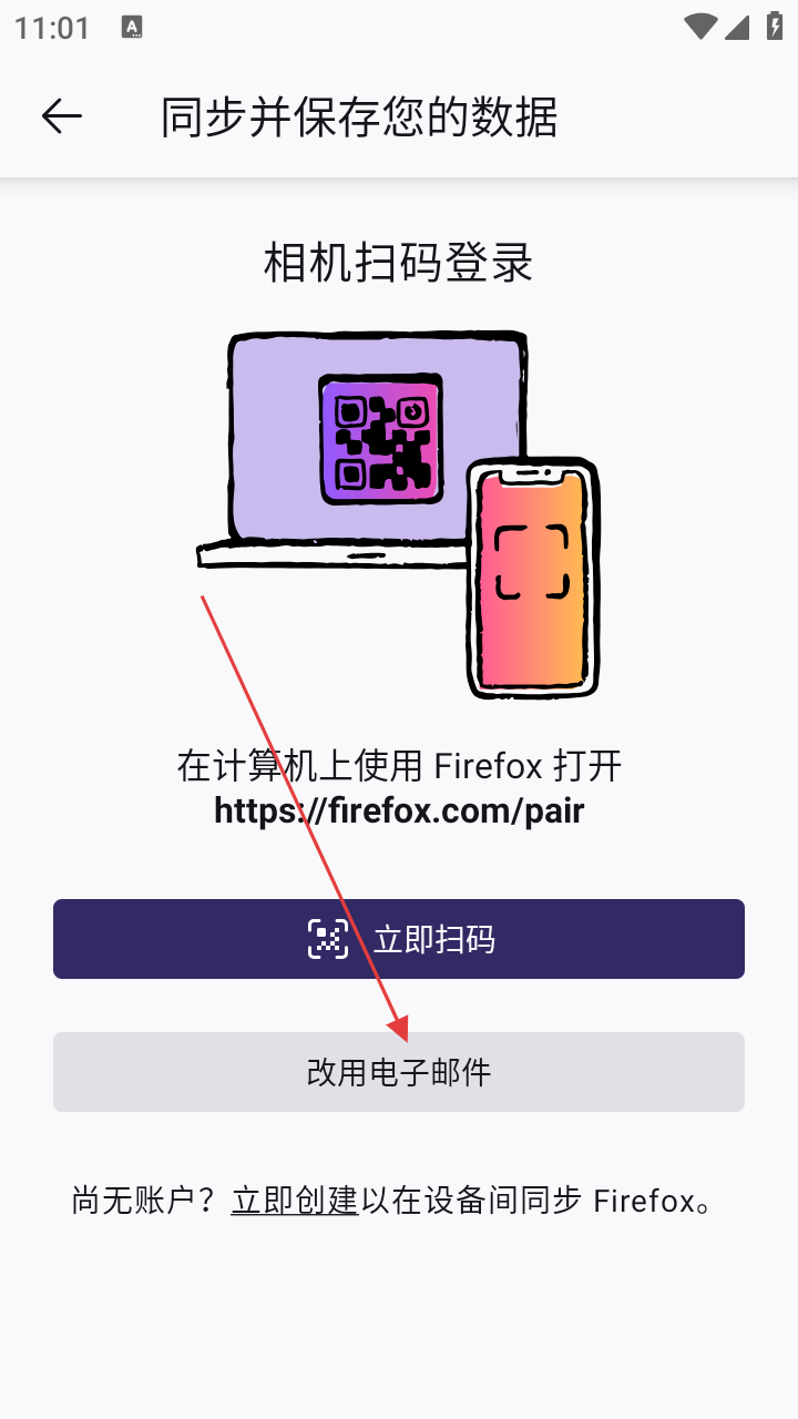 2、进入同步并保存数据页面,可选择【相机扫码登录】,也可点击【改用电子邮件】,通过邮箱方式登录。