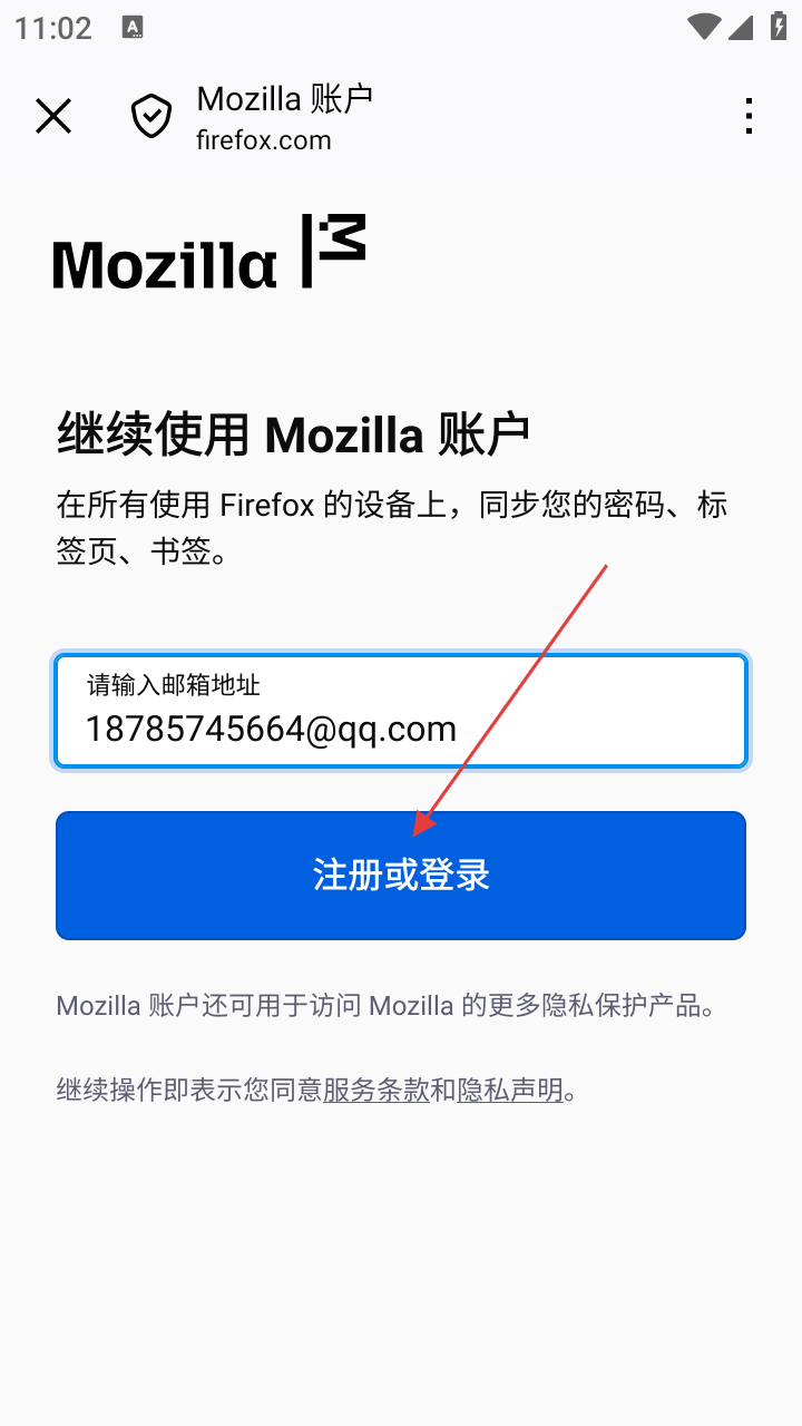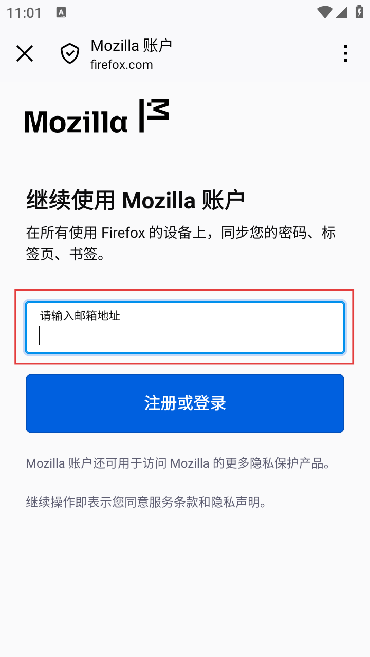 4、输入邮箱地址后,点击【注册或登录】按钮,即可完成Mozilla账户相关操作,实现Firefox数据同步。