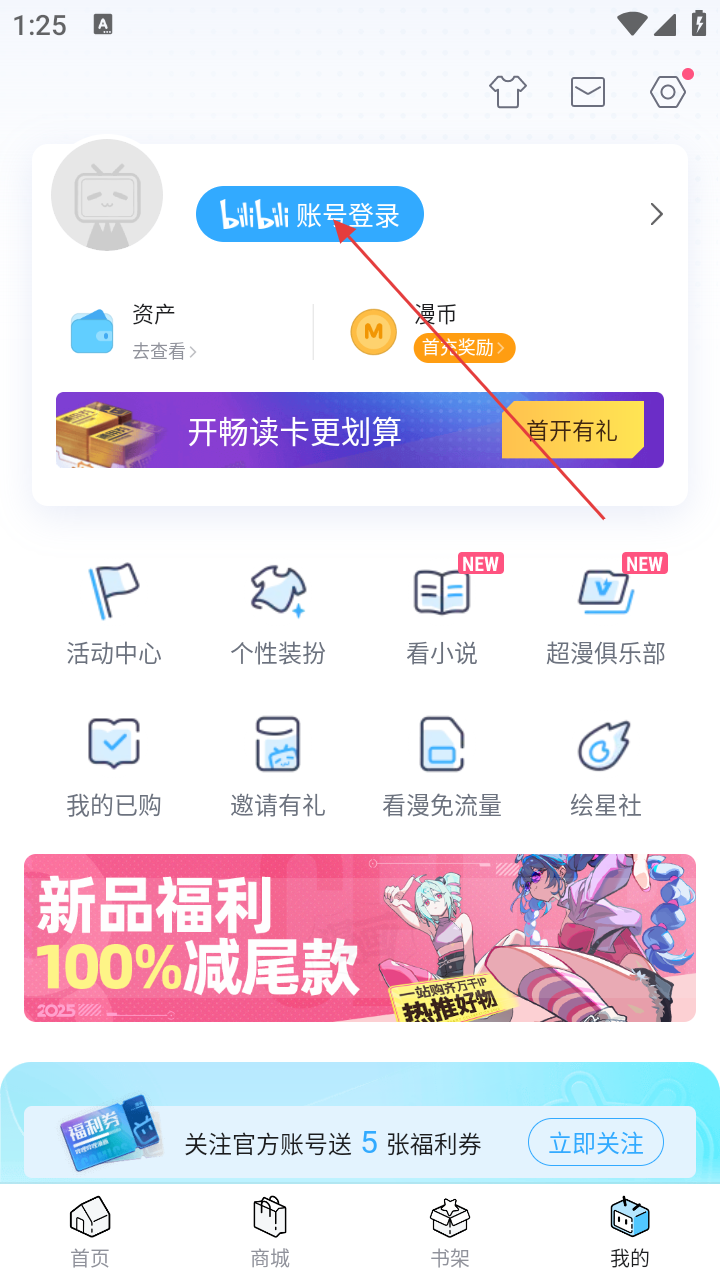 1、打开哔哩哔哩漫画,进入首页后,点击右下角【我的】,进入个人相关页面。