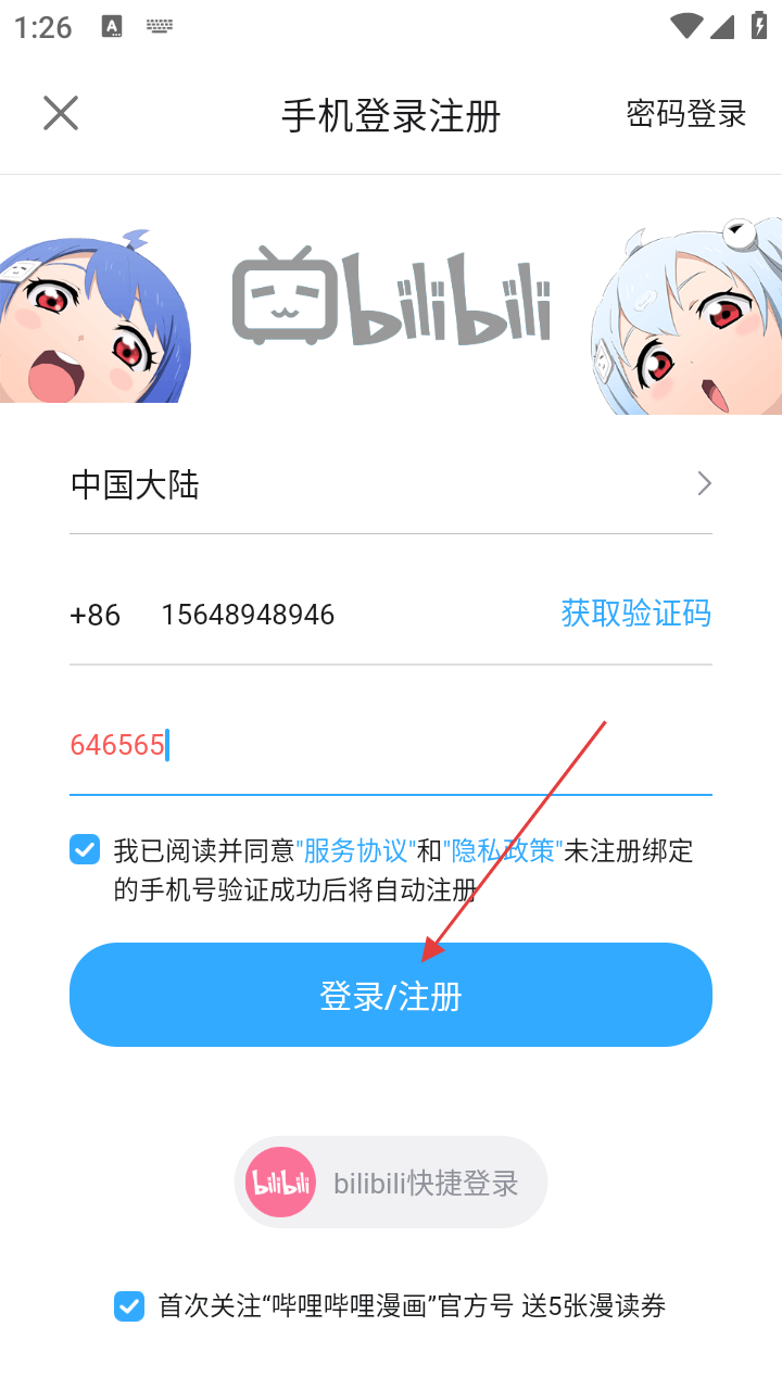 4、勾选同意服务协议和隐私政策后,点击【登录/注册】按钮,完成哔哩哔哩漫画的登录流程。
