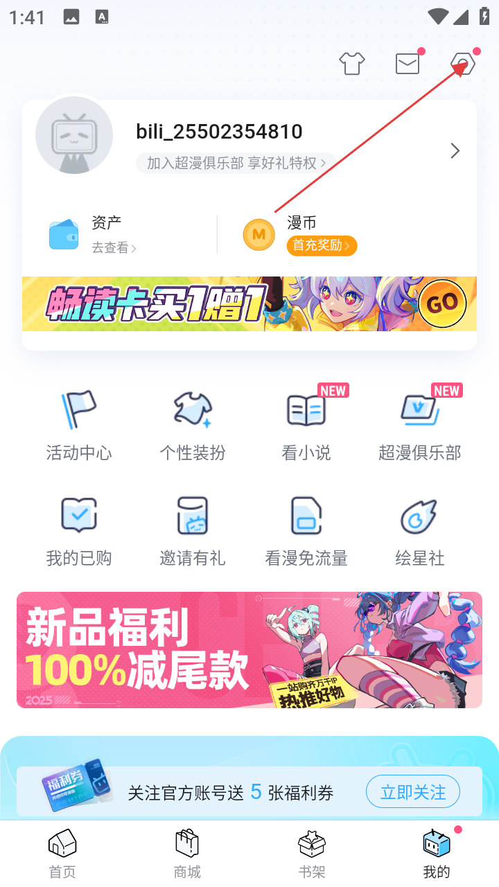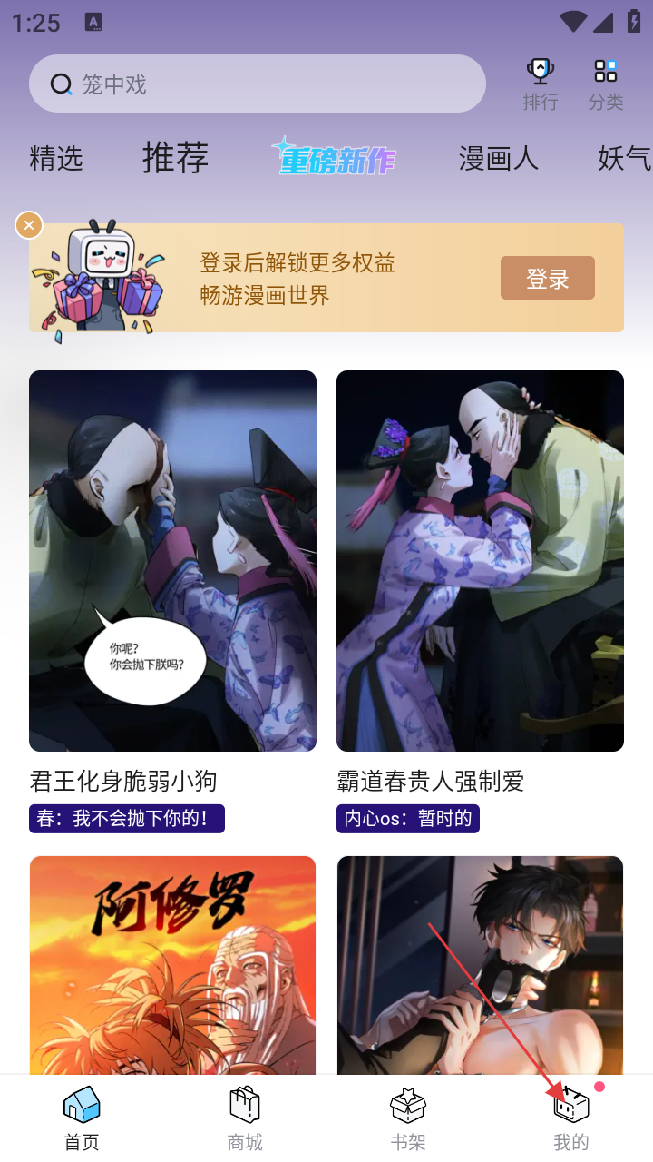 1、打开哔哩哔哩漫画,进入首页后,点击右下角【我的】,进入个人页面。