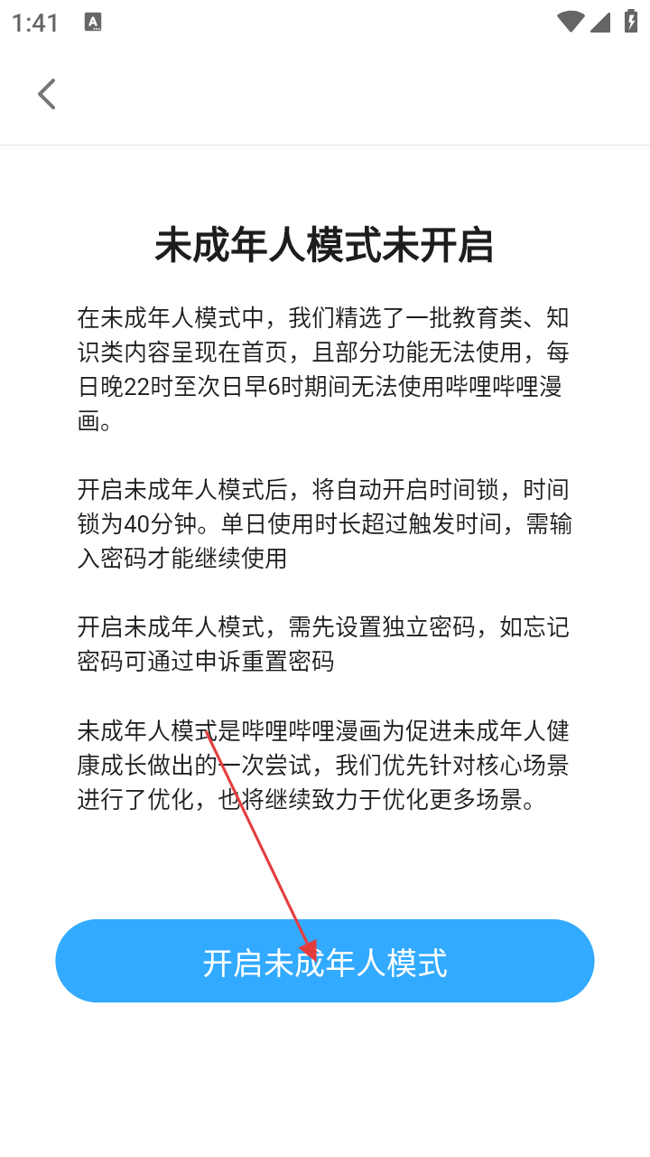 4、在未成年人模式设置界面,若未开启,可点击【开启未成年人模式】按钮开启该模式。
