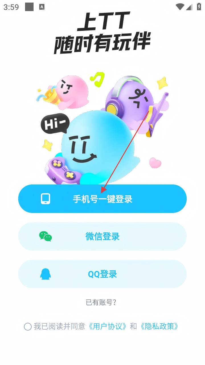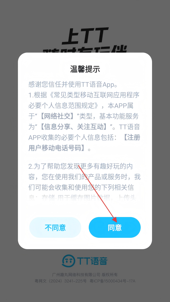 1、打开TT语音APP,首先弹出温馨提示弹窗,阅读后点击【同意】。