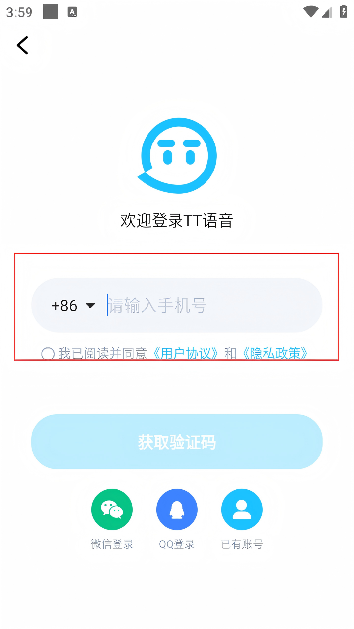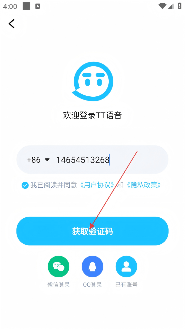 3、在手机号输入框中输入手机号码,勾选【我已阅读并同意《用户协议》和《隐私政策》】。