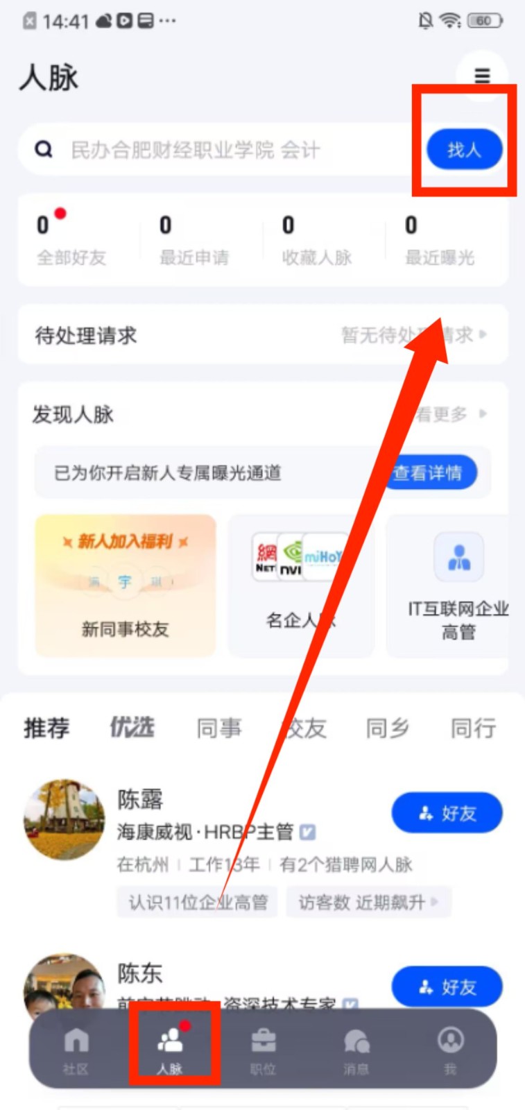 1、进入 “人脉” 页面,点击右上角 “找人” 按钮,可通过搜索定位目标人脉资源。