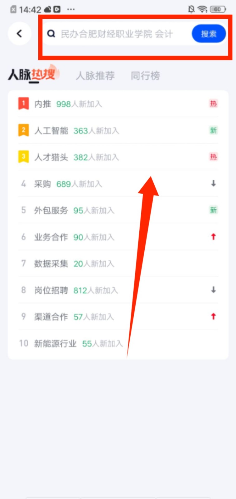 2、在搜索页输入信息后点击 “搜索”,能查看相关的人脉热搜、推荐等内容。