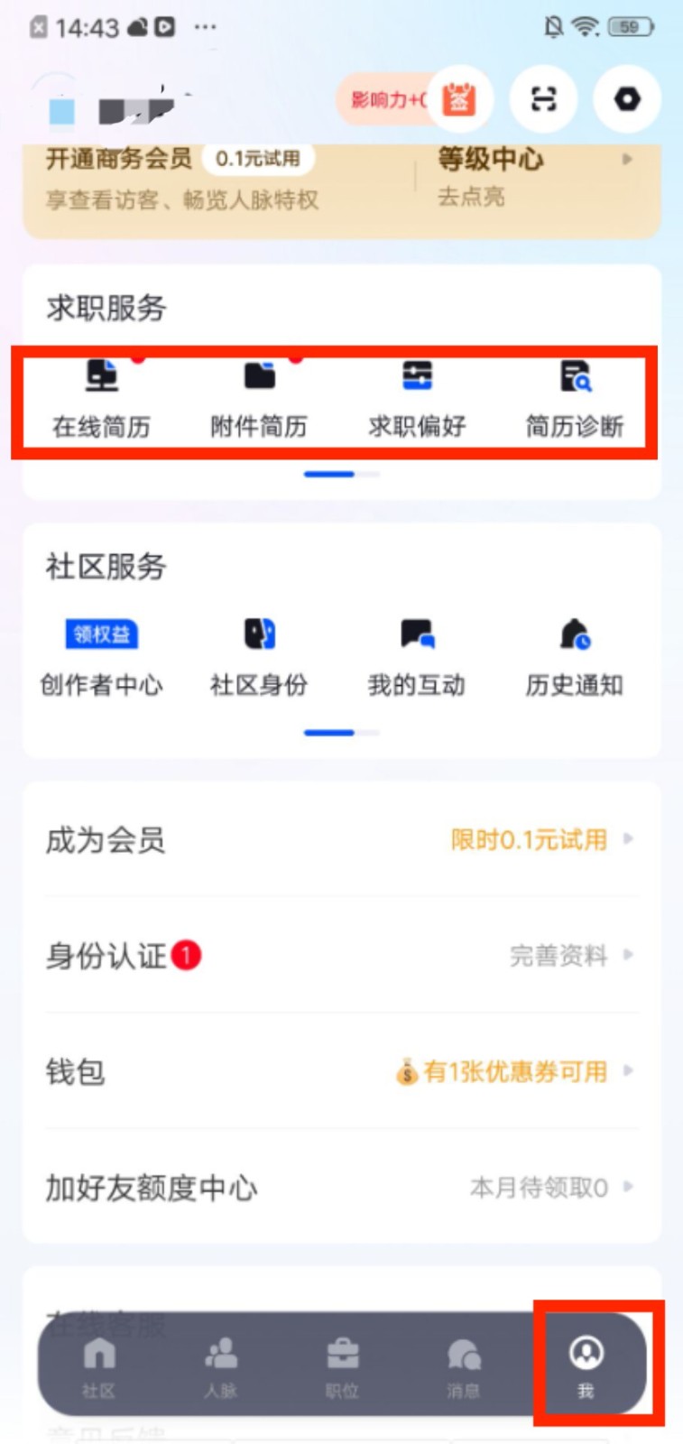 3、切换到 “我” 的页面,在求职服务板块可管理在线简历、调整求职偏好等信息。