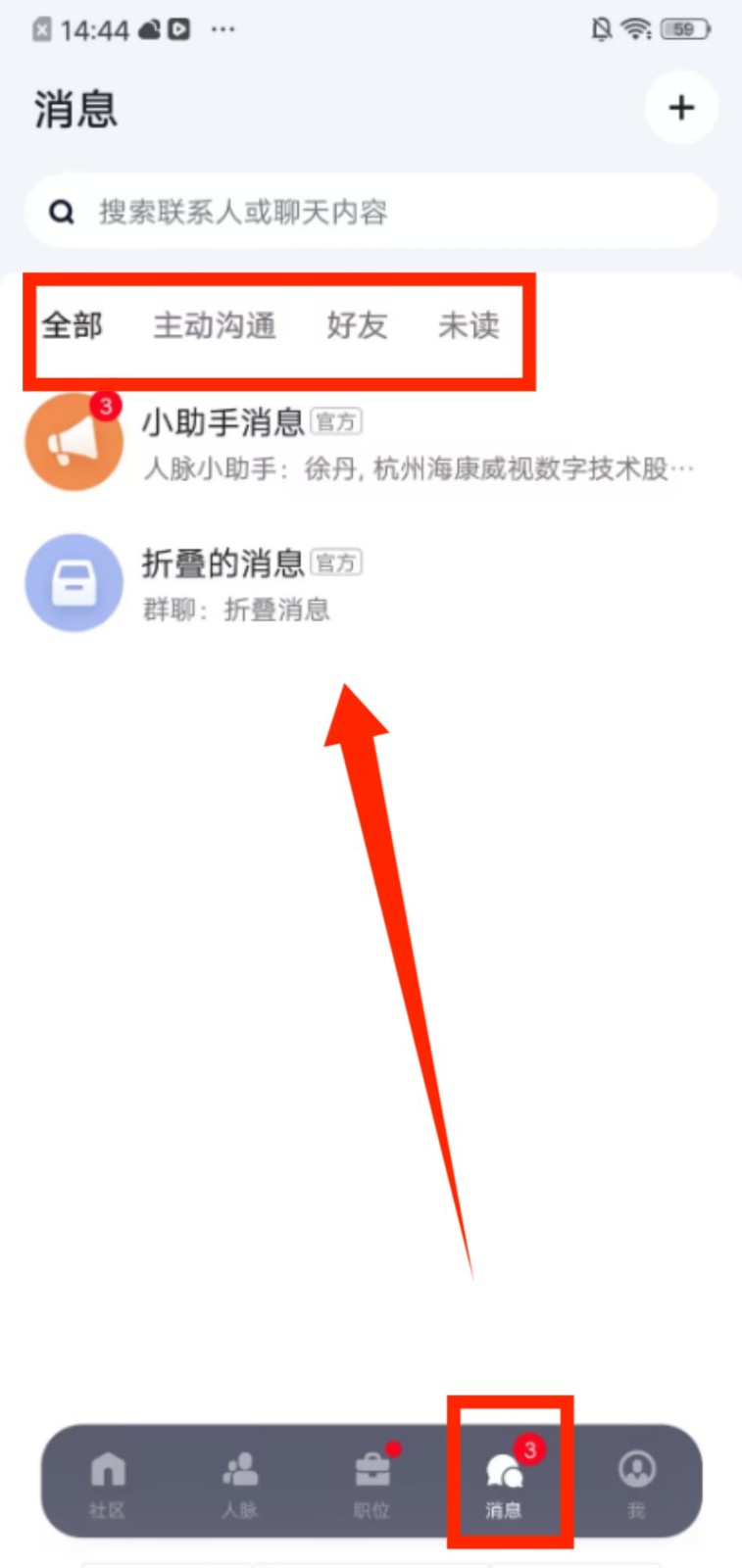 4、点击 “消息” 进入对话页,通过 “全部”“好友” 等分类,查看不同类型的消息通知。