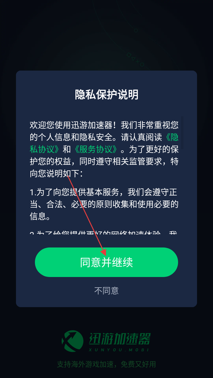1、打开【迅游加速器】,需先阅读隐私保护说明,点击【同意并继续】方可进入后续流程。