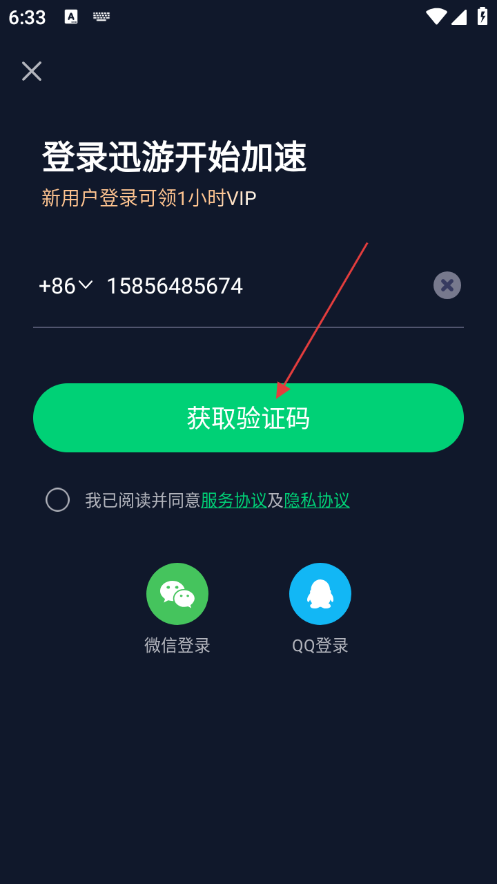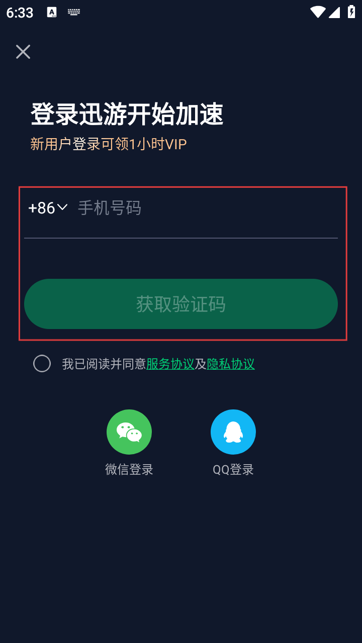 2、在登录界面,可输入手机号码,也可选择【微信登录】或【QQ登录】,新用户登录还可领1小时VIP。