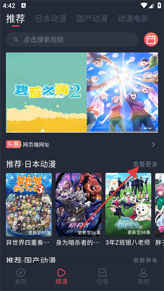 2、进入软件【频道】页,可浏览《异世界四重奏3》《3年Z班银八老师》等推荐动漫,点击【查看更多】可浏览更多同类动漫。