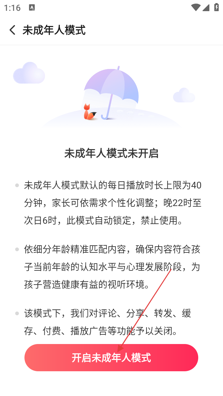 4、在未成年人模式页面,点击【开启未成年人模式】,规范未成年人观看。