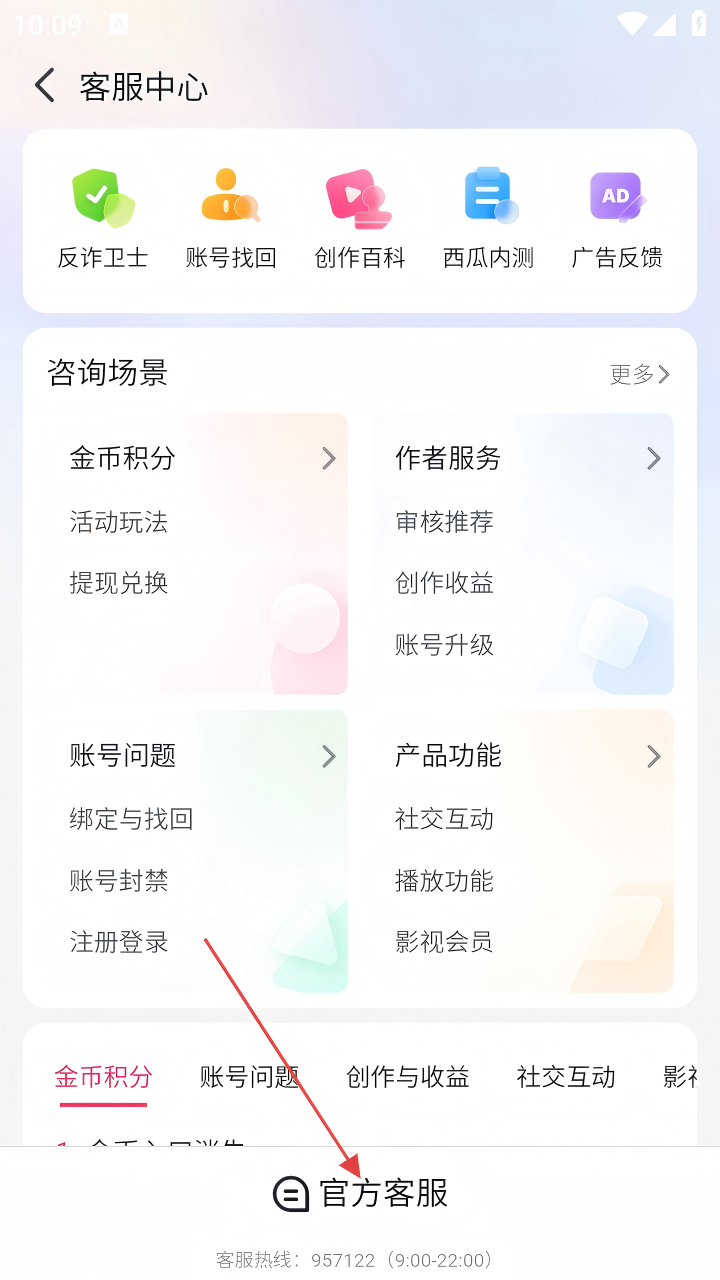 3、在客服中心页面,点击底部的【官方客服】,弹出问题场景选择框。