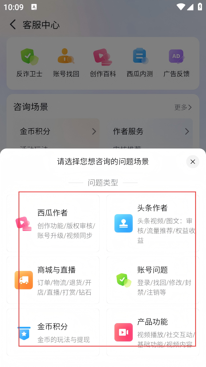 4、在问题场景选择框中,选择对应的问题类型,即可与官方客服进行咨询。