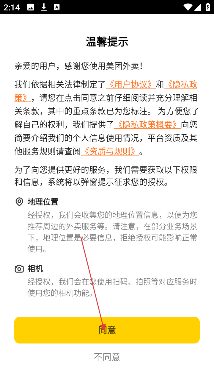 1、打开美团外卖,会看到温馨提示页面,仔细阅读后点击【同意】,即可进入首页。