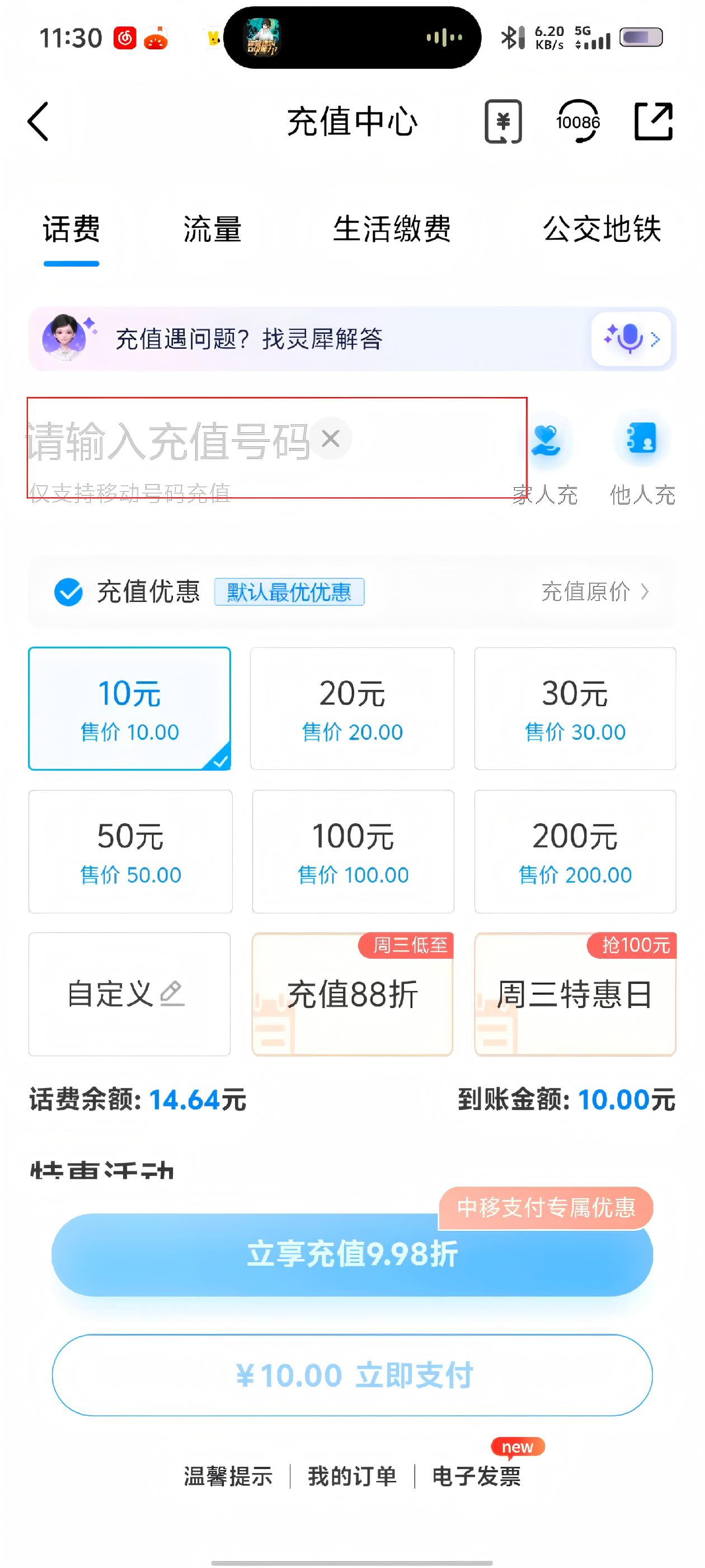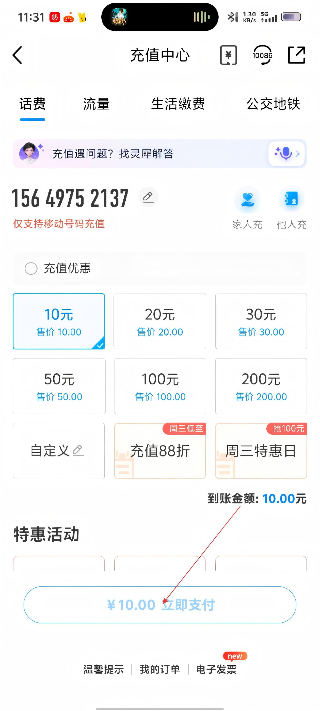 3、填好手机号码后,选择充值金额,如10元,然后点击【立即支付】。