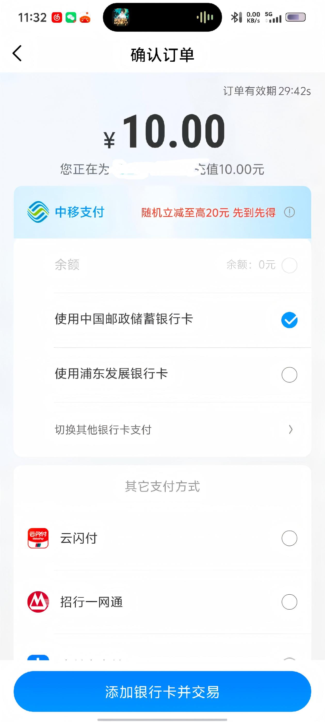 4、进入确认订单页面后,选择支付方式,如使用银行卡或云闪付等,最后点击【添加银行卡并交易】或对应的支付确认按钮,完成话费充值。