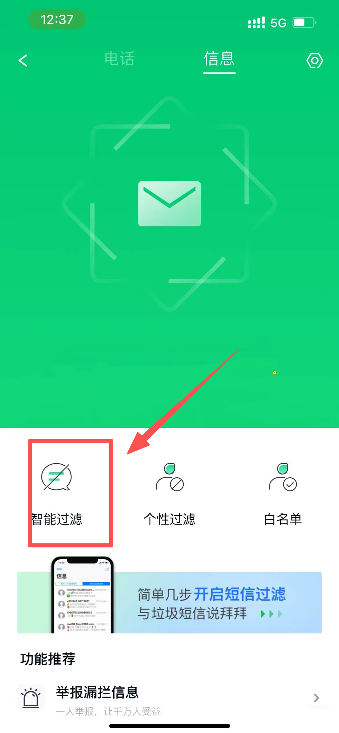 2、进入“骚扰拦截”开启智能过滤,选强力模式自动屏蔽诈骗推广短信。