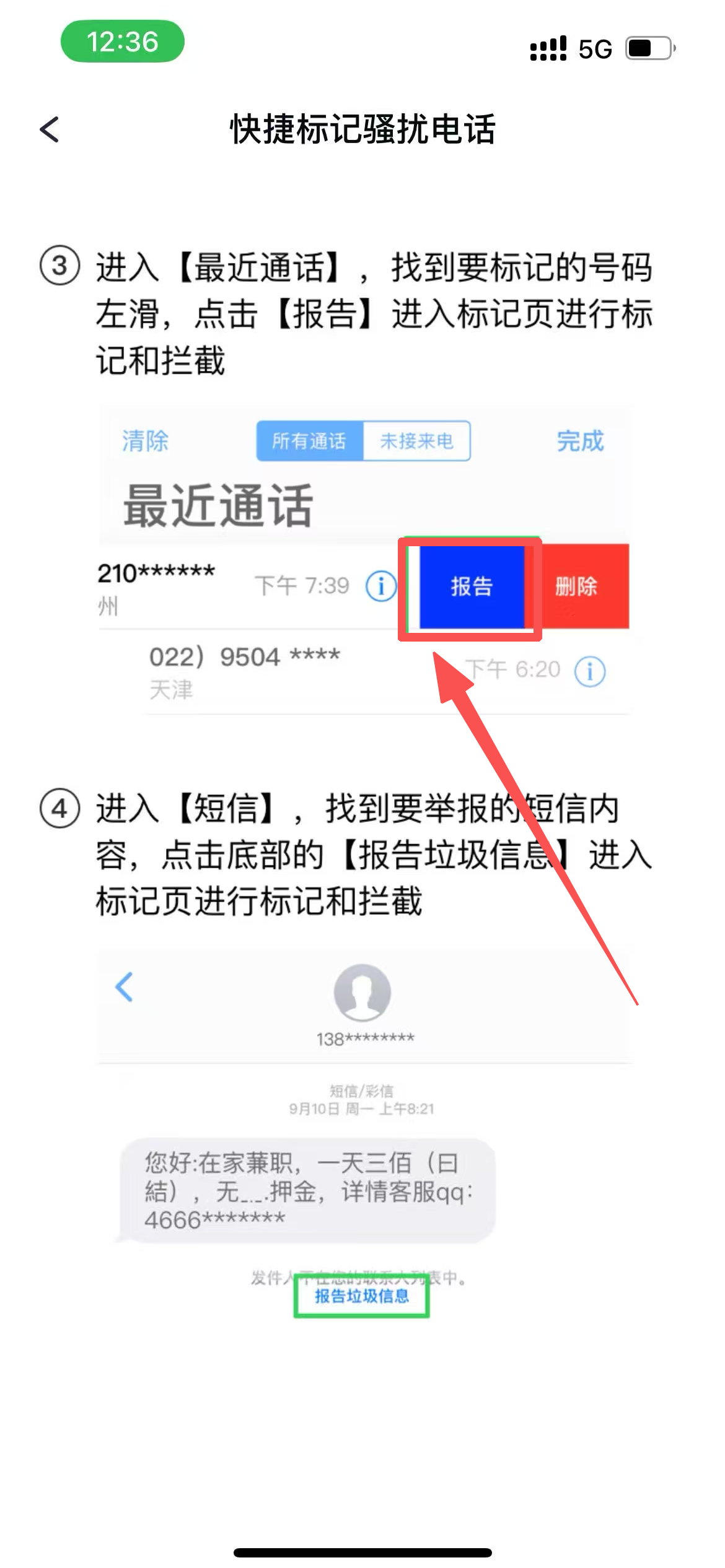 4、到“最近通话”左滑号码点“报告”,快捷标记骚扰电话并同步拦截。