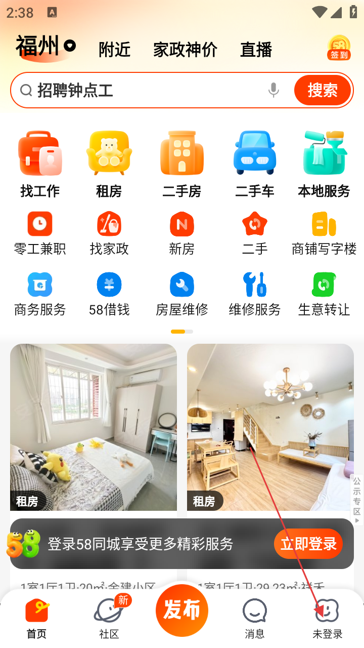 2、在58同城主界面,有找工作、租房等服务入口,点击右下角【未登录】进入登录页面。