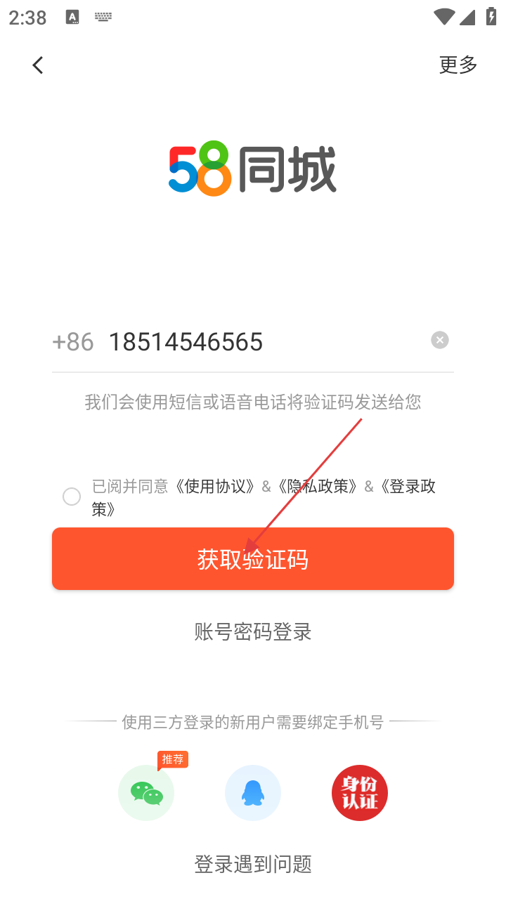 3、在登录页面,输入手机号,勾选同意相关协议,准备获取验证码。