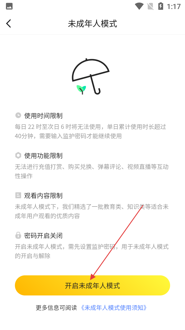 4、进入未成年人模式界面后,点击【开启未成年人模式】按钮,即可开启该模式。