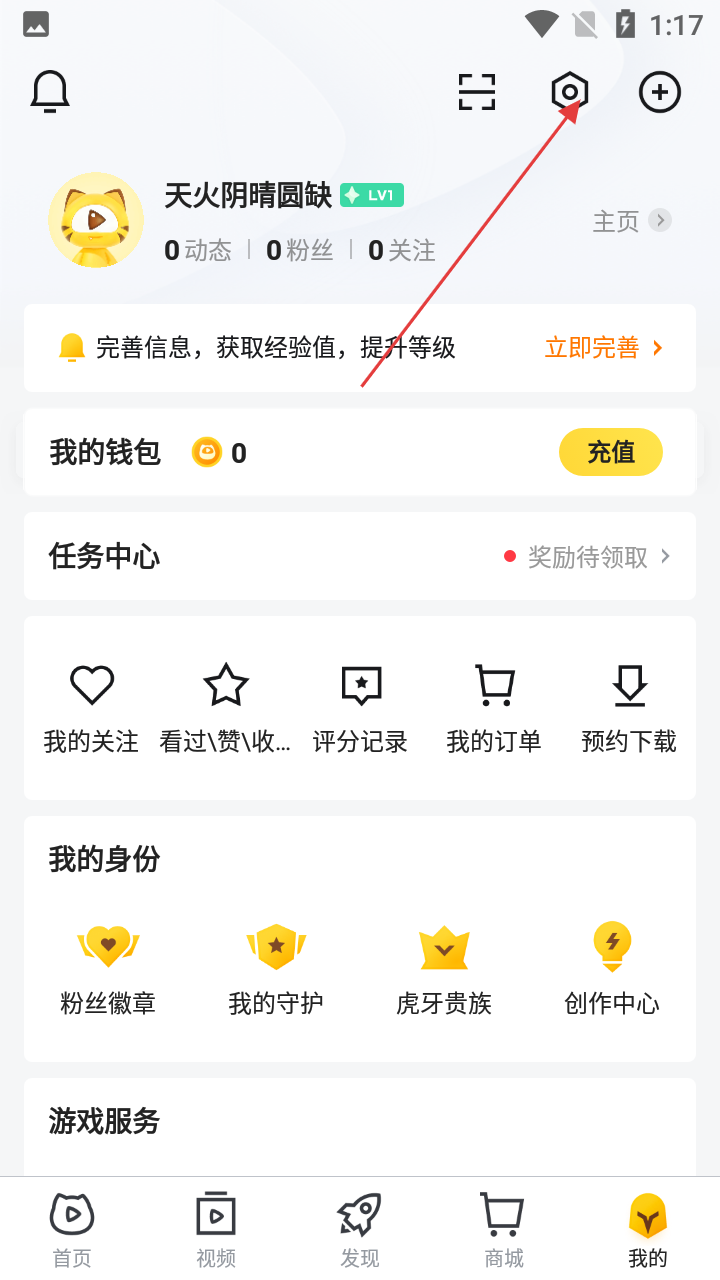2、进入【我的】页面后,点击右上角设置图标,进入设置界面准备进行相关设置。