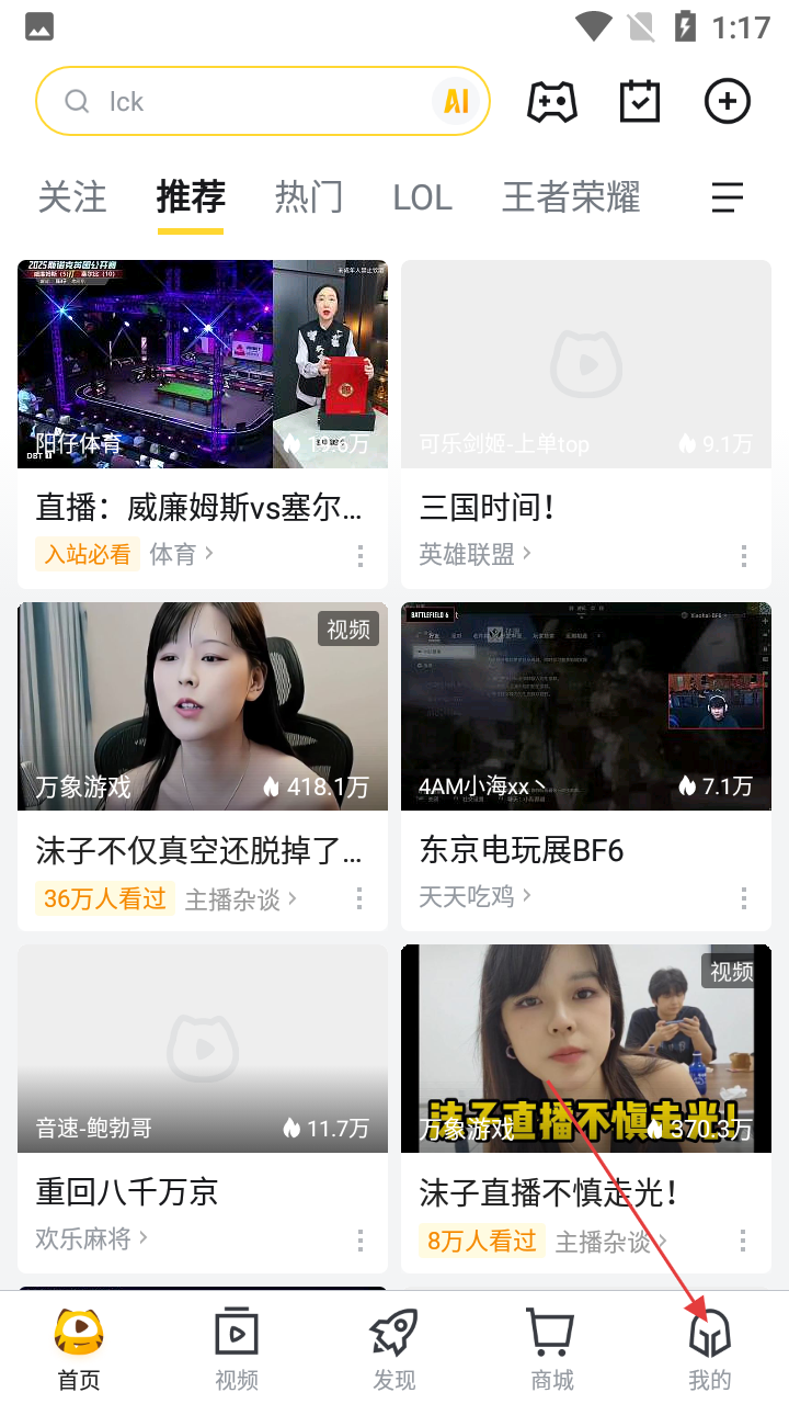 1、打开虎牙直播APP,进入首页后,若要进行个人相关设置,点击右下角【我的】按钮。