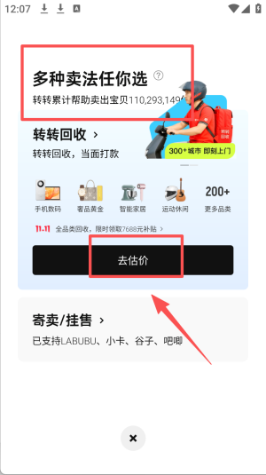 3、选择卖法:在首页点击“去估价”或选择“寄卖/挂售”进行二手商品交易。