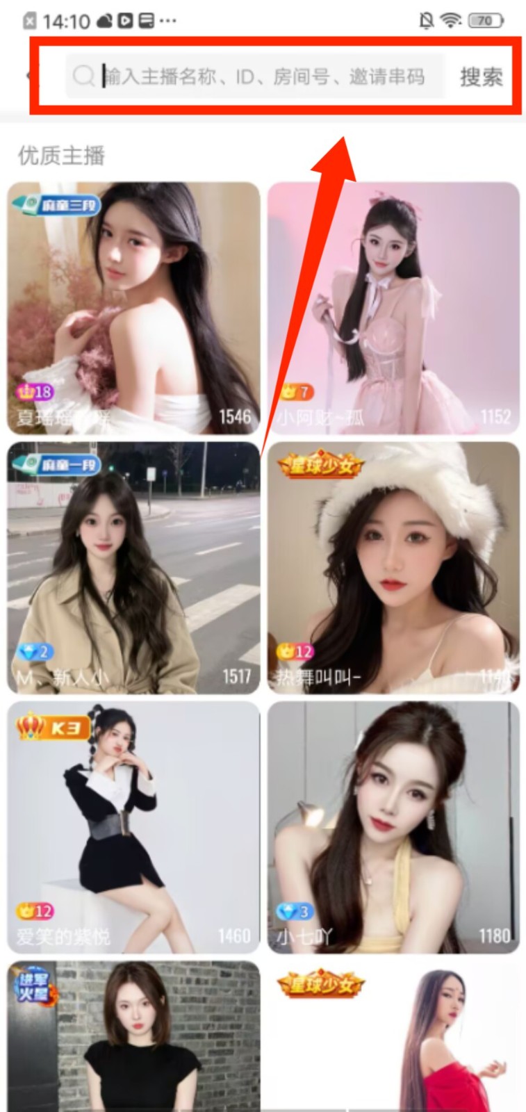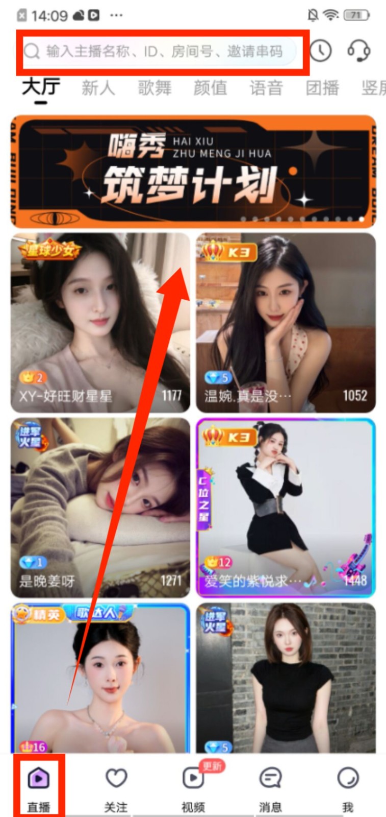 1、进入 “直播” 页面,可在顶部搜索框输入主播信息,也能直接浏览大厅里的各类直播内容。