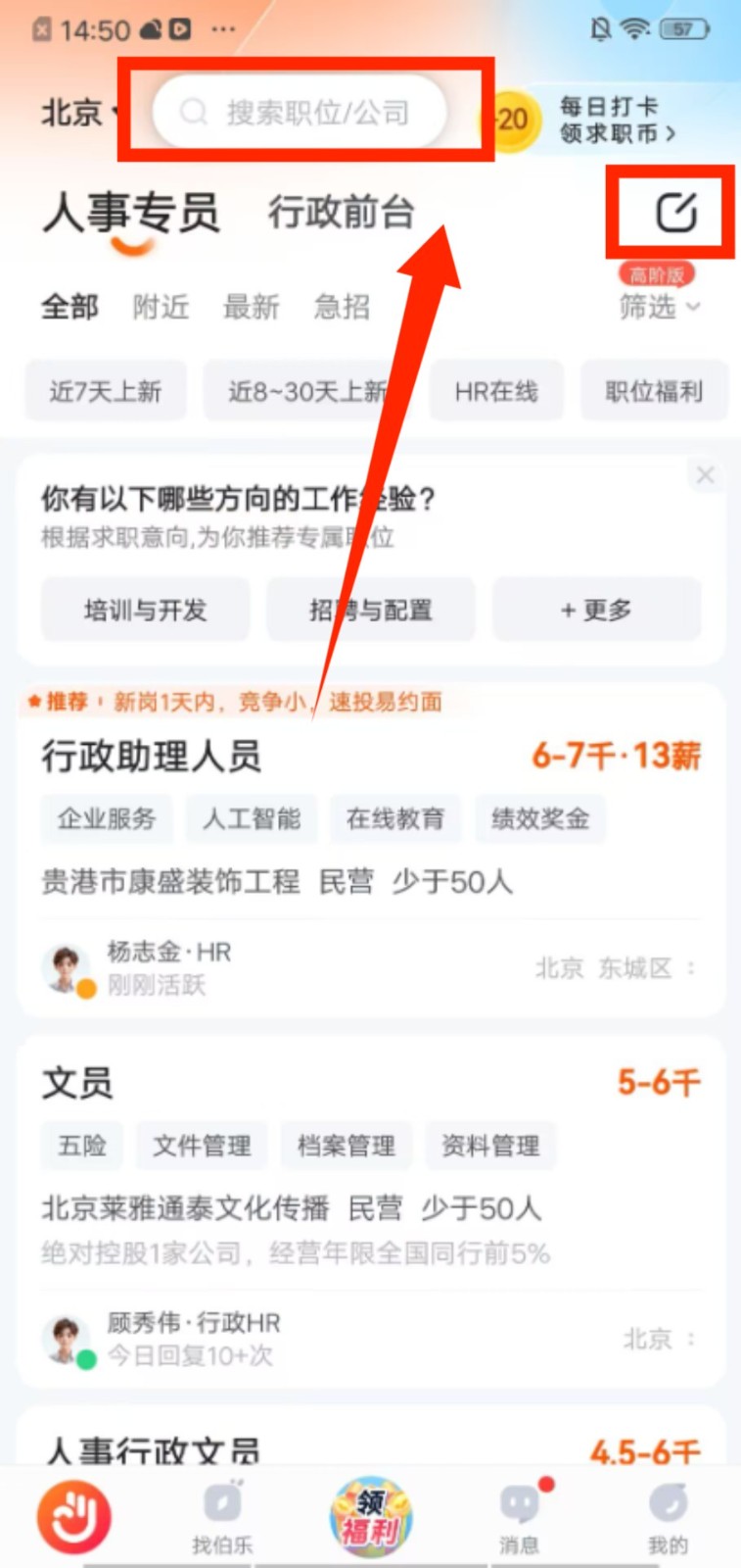 1、进入职位页面,点击顶部搜索框输入岗位或公司名称,也可通过筛选功能缩小求职范围。