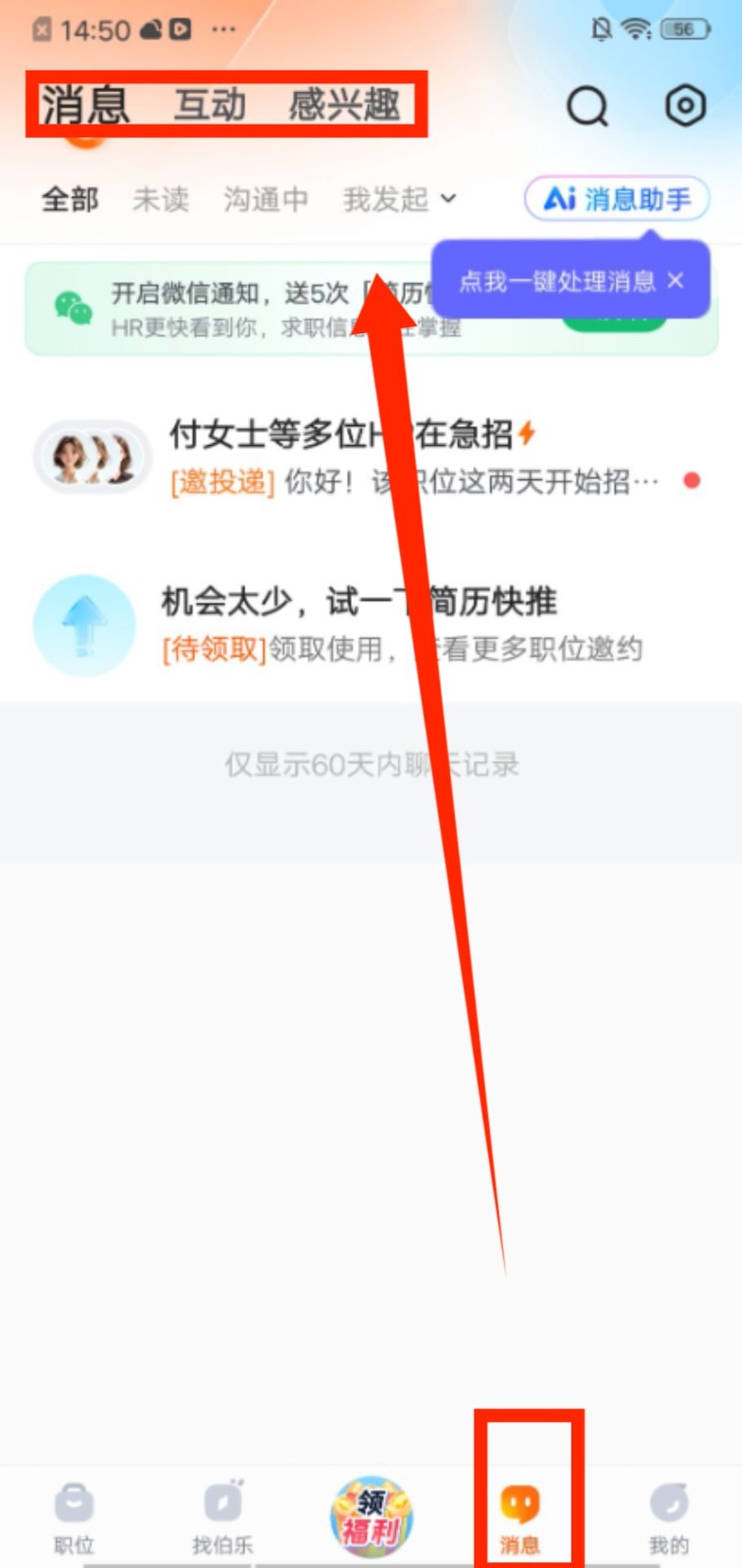 2、切换到 “消息” 页面,可查看 HR 的邀投递信息,还能在 “互动”“感兴趣” 板块管理沟通内容。