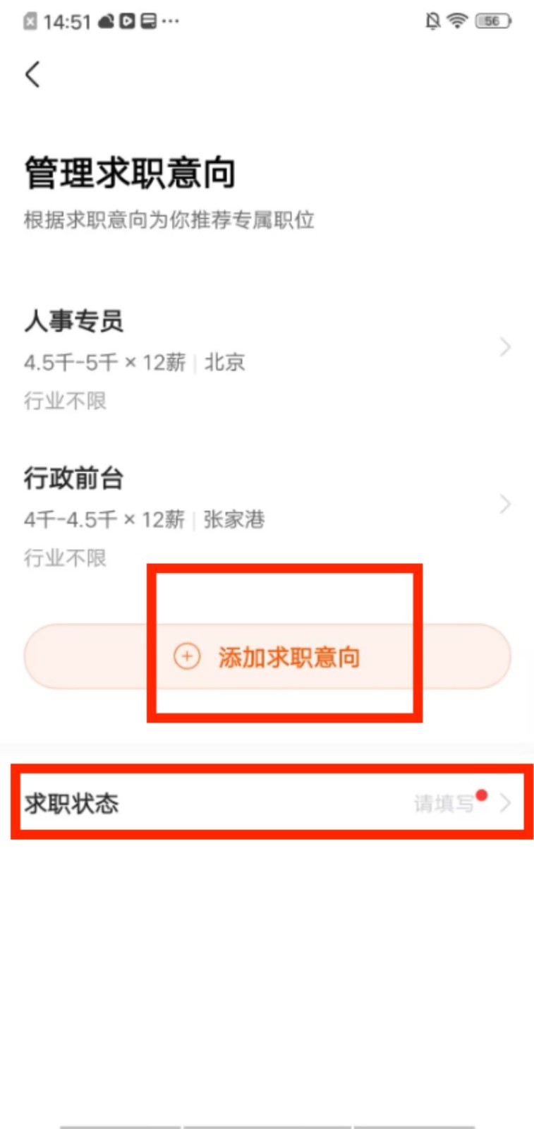3、进入管理求职意向页面,点击 “添加求职意向”,可补充新的求职方向,完善求职偏好。
