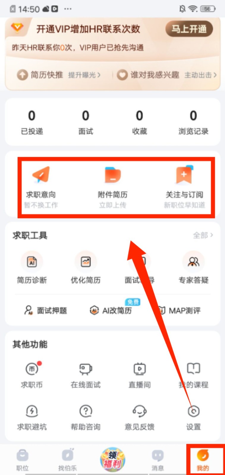 4、点击 “我的” 进入个人页面,能管理求职意向、上传附件简历,也可使用求职工具优化求职材料。