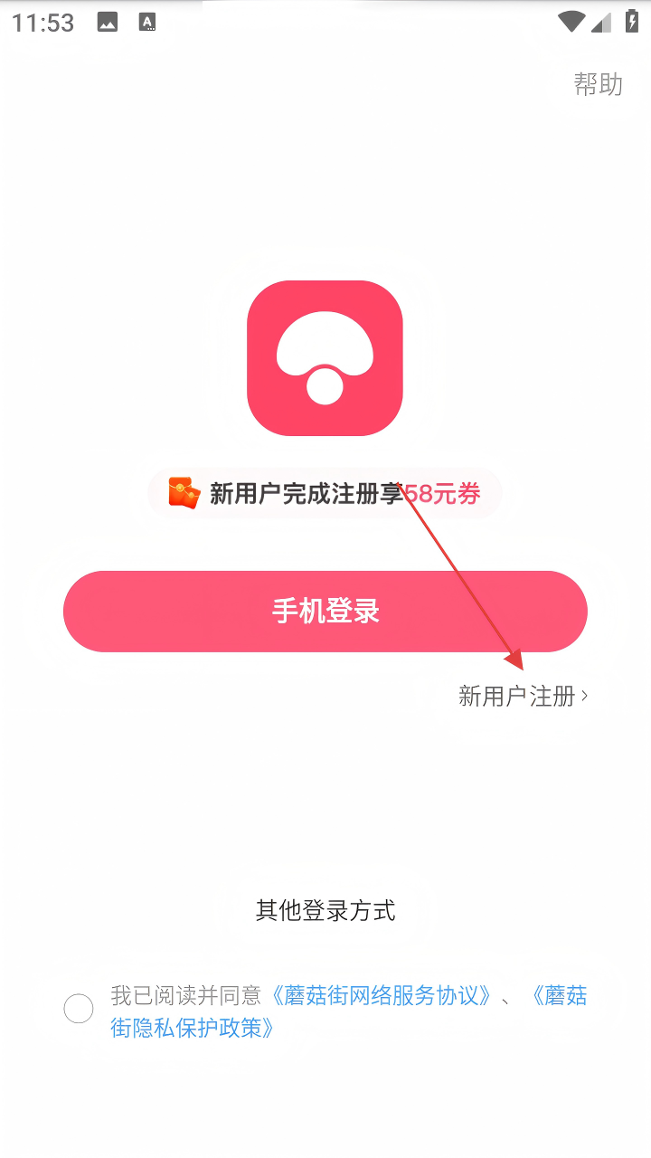 2、同意协议后,进入登录注册页面,点击【新用户注册】。