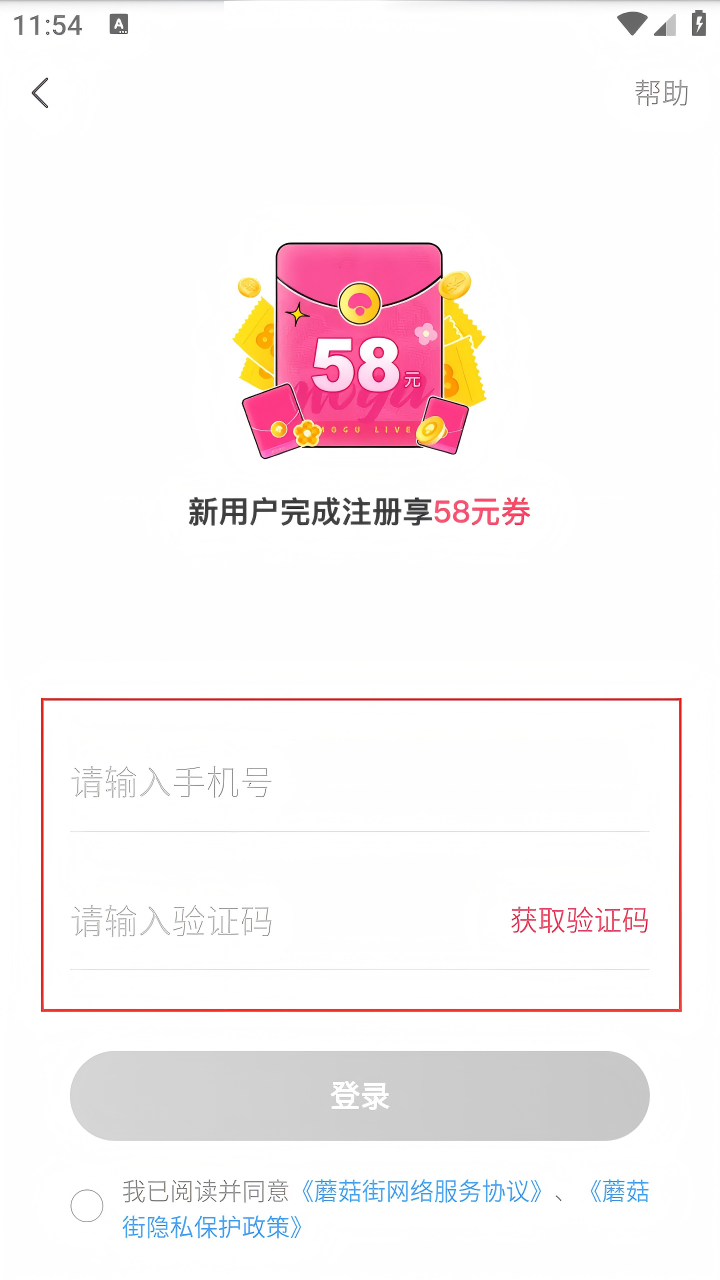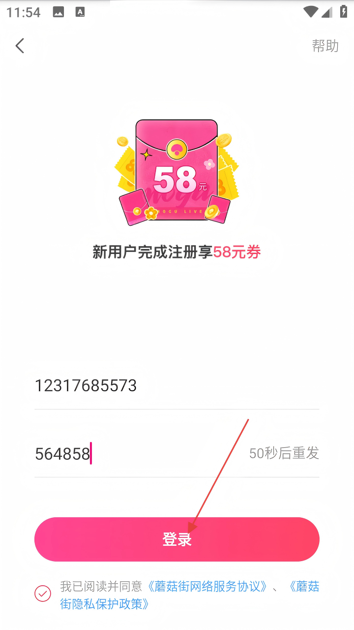 4、收到验证码后,在【请输入验证码】输入框中填写验证码,即可完成新用户注册登录。